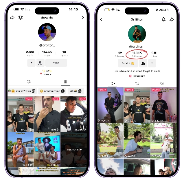 אור ביטון עשה קפיצה מדהימה בטיקטוק בשנה האחרונה. מיליוני צפיות בארץ ועשרות אלפי עוקבים בעבודה של כמה חודשים בלבד! כיום אור מעלה קבוע את רמת התוכן והצילום וממשיך לקבל קמפיינים.